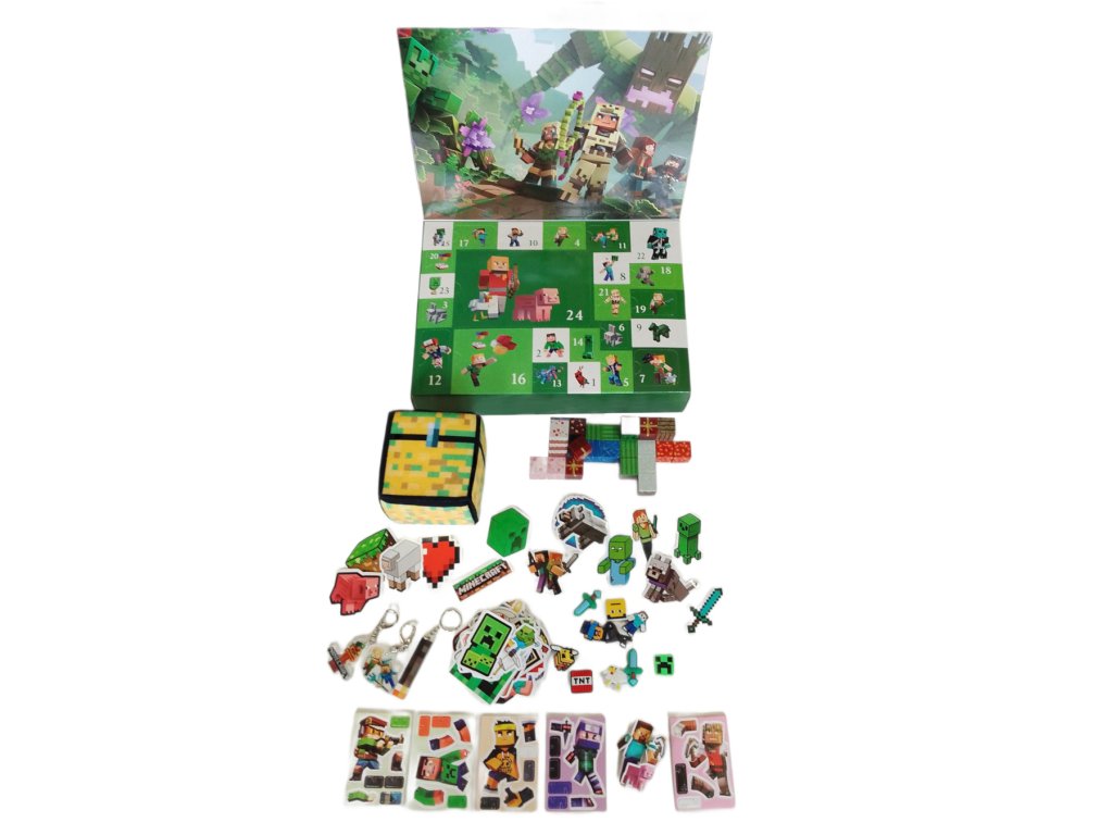 Uvnitř kalendáře najdete pestrý mix drobností – od magnetických stavebních kostek s herními texturami přes figurky, samolepky a gumové přívěsky až po tematické klíčenky a dekorace. Výraznou součástí je i měkká kostka s designem truhly, která slouží jako hrací prvek. Vše laděno v ikonickém Minecraft stylu.