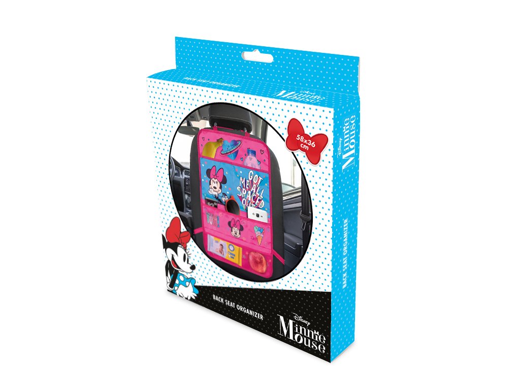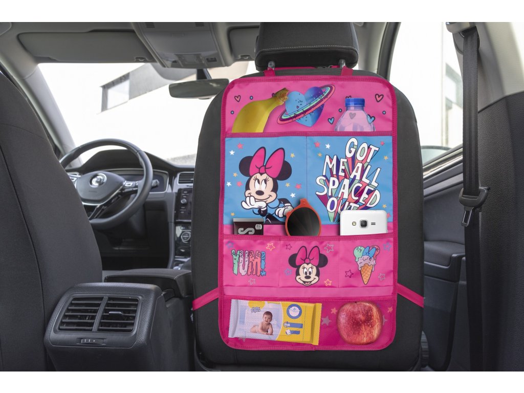 Jak udržet v autě pořádek a mít pro děti vše přehledně uložené? Myška Minnie ráda pomůže. Organizér do auta - super pomocník na cesty s dětmi. Je vhodný pro většinu autosedaček a také do dětských kočárků nebo golfových holí. Snadno se instaluje pomocí nastavitelných popruhů vybavených rychlosponami. Organizér má různě velké kapsy na lahve, svačinu, hračky, ubrousky. Na vše, co je při cestách s dětmi potřebné a vše je vždy po ruce.