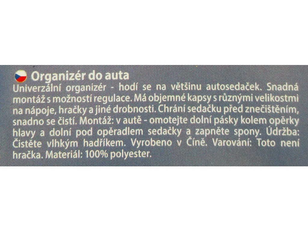 Tento produkt je určen k připevnění na zadní stranu předního autosedadla. Montáž je velmi snadná. Organizér se i velmi snadno se čistí.