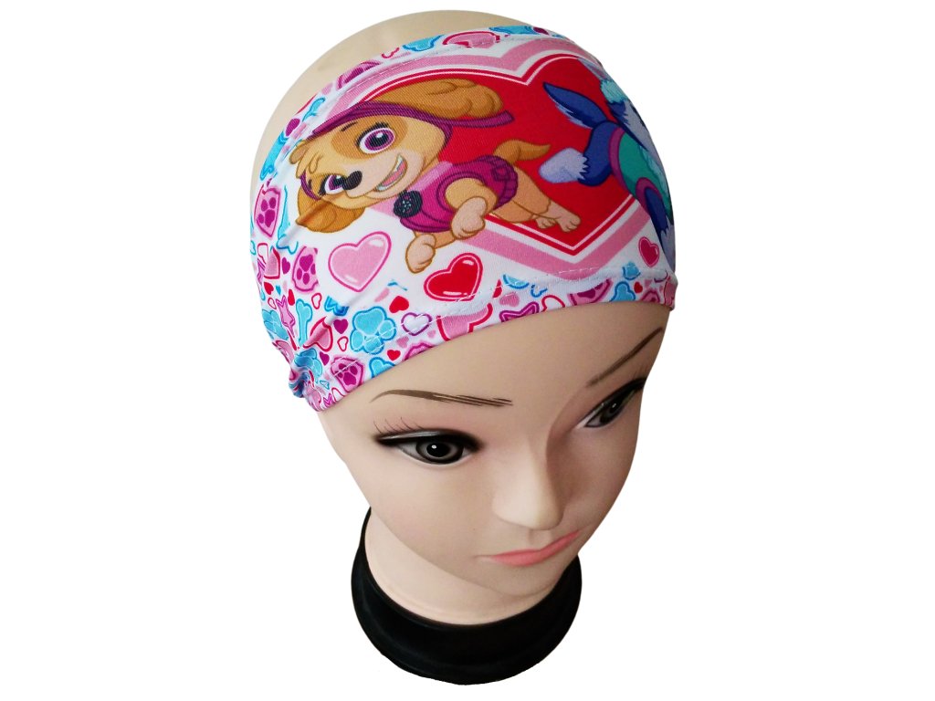 Lehounká elastická čelenka s látkovými motivy pejsků záchranářů, vzadu do příjemné pružné gumy, takže výborně sedí.