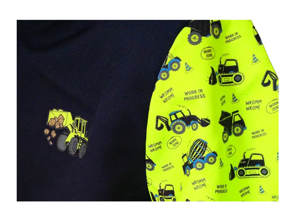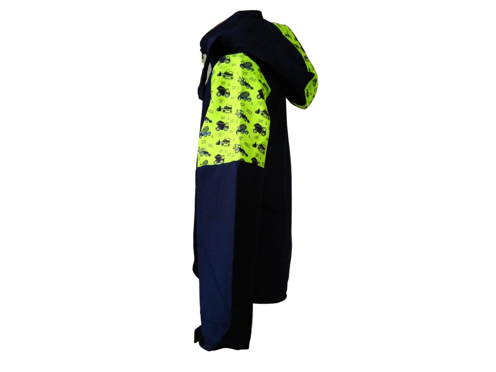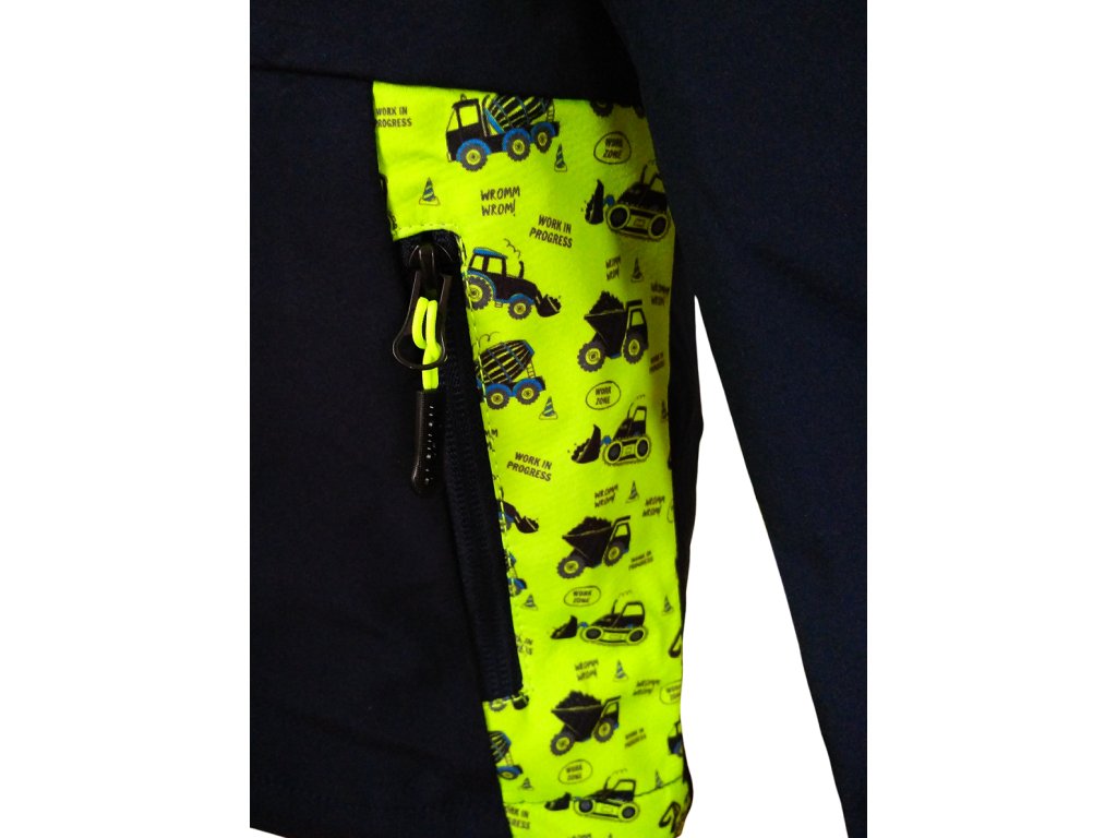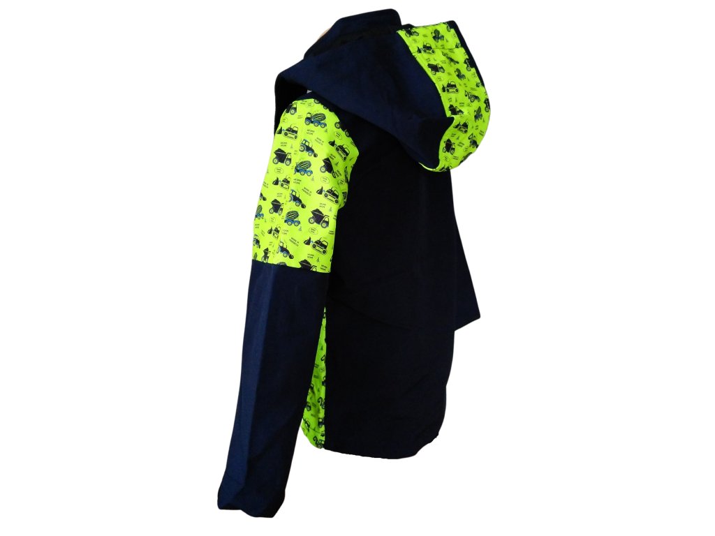 Bagry kluci milují a chlapecká bunda se stavebními stroji a dopravními prostředky nejen poslouží, ale udělá i radost. Chlapecká bunda do každého počasí je velmi kvalitní svým zpracováním i materiálem. Bundička je lehčí, bez vyteplené podšívky, má prodlouženou zádovou část šitou do oblouku. U krku stojáček, aby nezafukovalo a samozřejmostí je i odepínací kapuca na zip. Přední kapsy jsou také se zapínáním na zip, vnitřní bez zapínání. Rukávy jsou na koncích opatřeny regulací a suchý zip. Bundička je odolná proti větru, prodyšná.