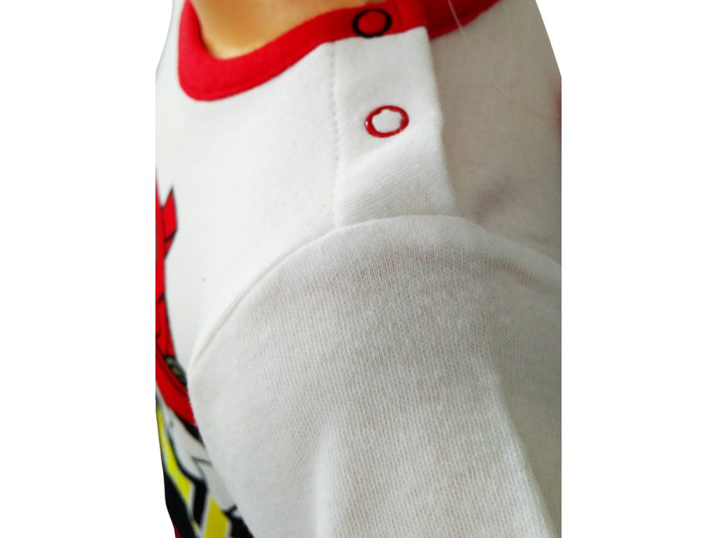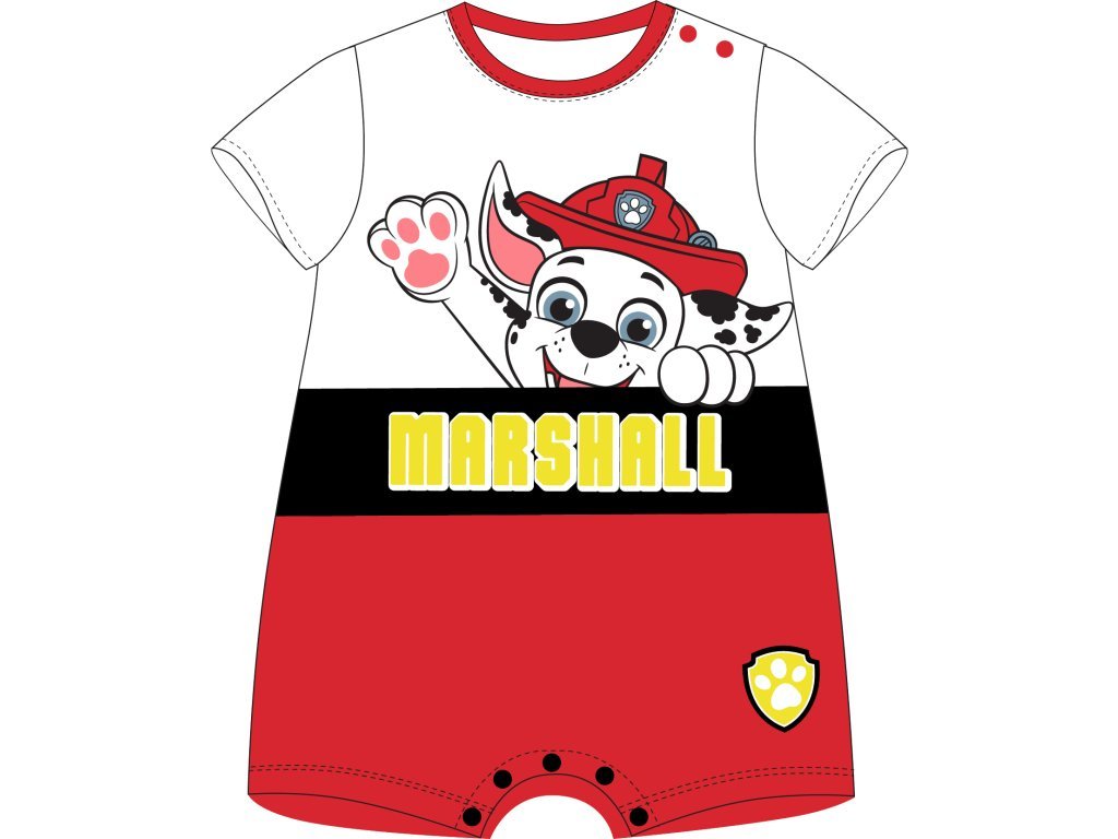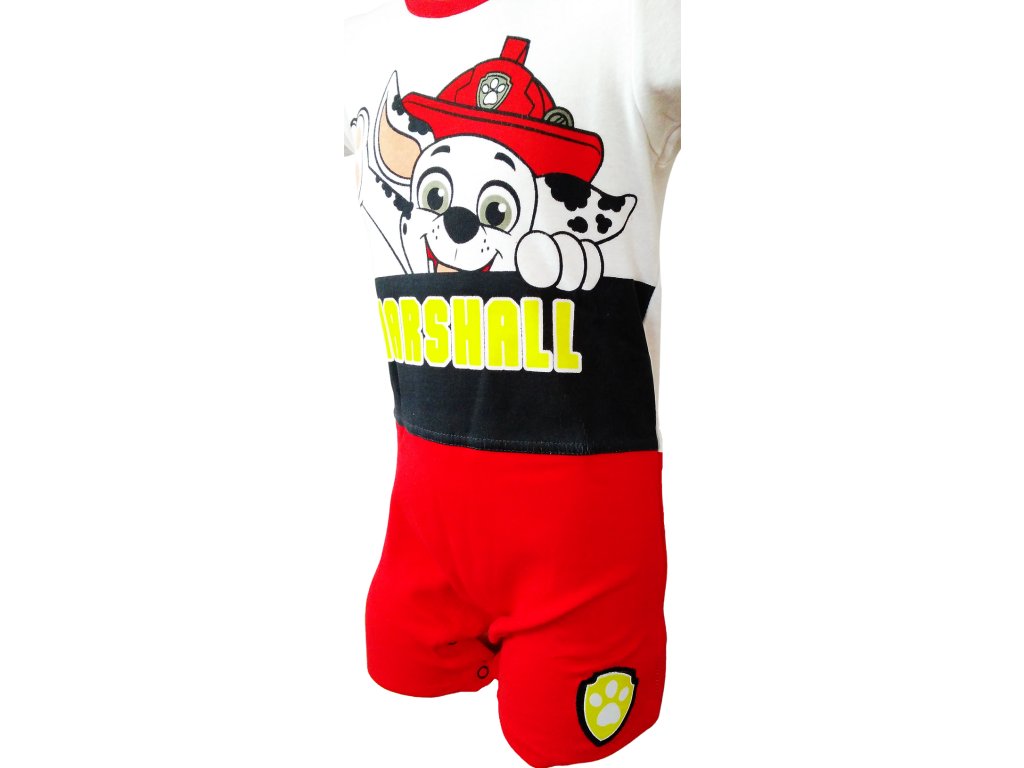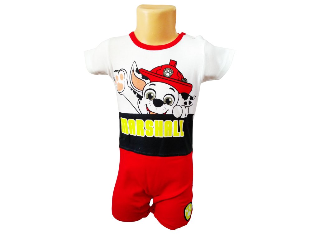 Letní overal Paw Patrol. Krásný a velmi příjemný letní overálek s Marshallem je vyroben z pružné kvalitní bavlny, s celolátkovým motivem. Zapínání má v rozkroku na patentky a pro snadné oblékání jsou i dvě patentky na ramenu u krku.