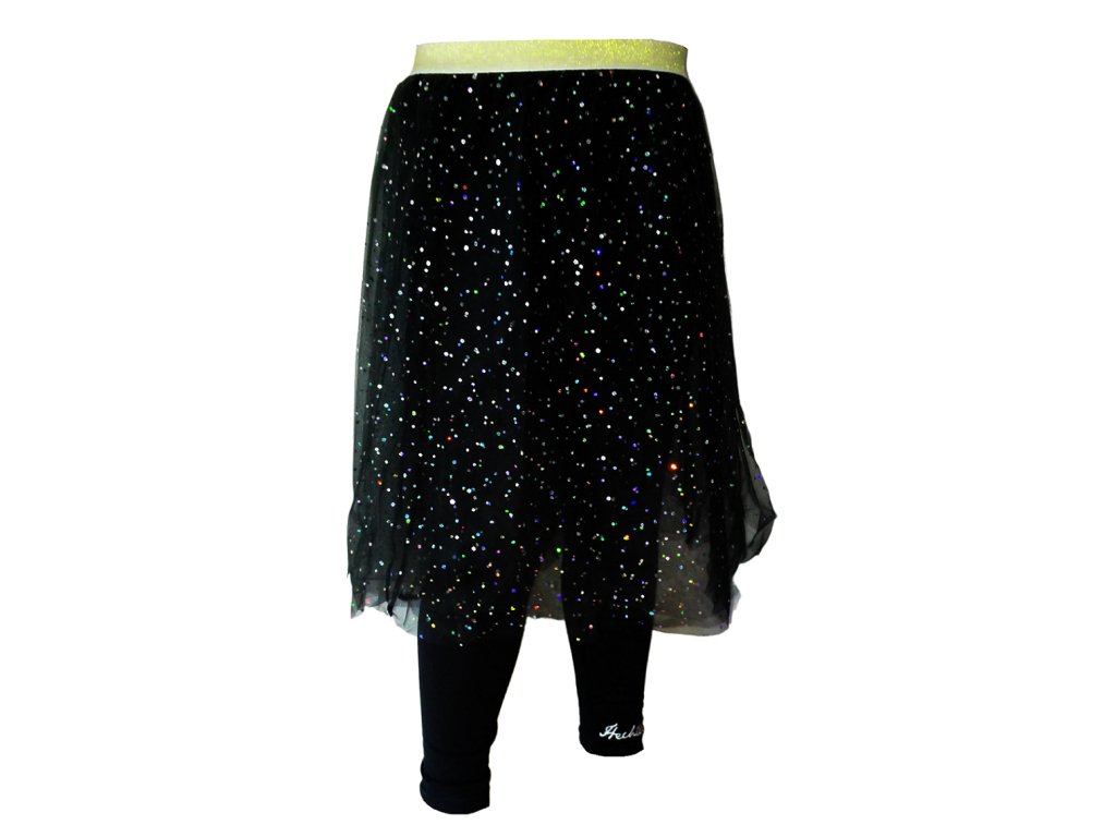 Luxusní, velmi příjemné a pohodlné legínky, doplněny sukýnkou z třívrstvého jemného tylu zdobeného třpytivými flitry. V pase pružná guma s metalickou nitkou. V reálu barva nádherně světle losososvá a druhá varianta černá.