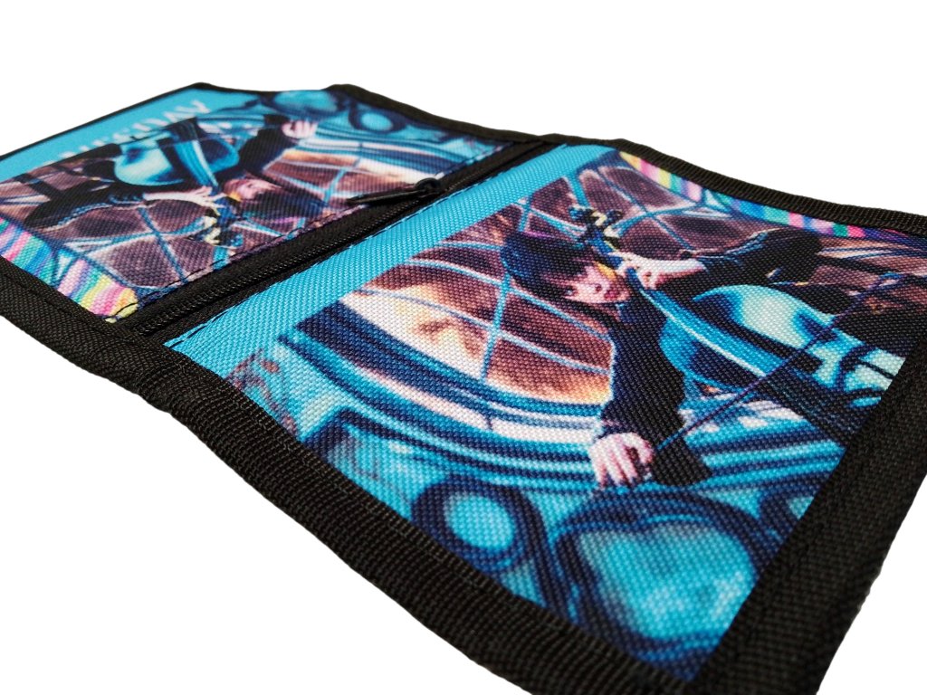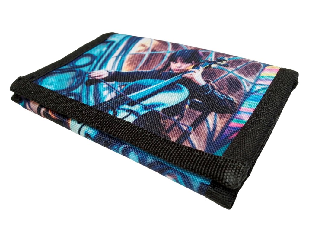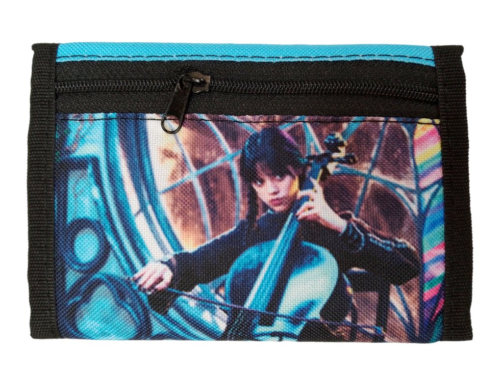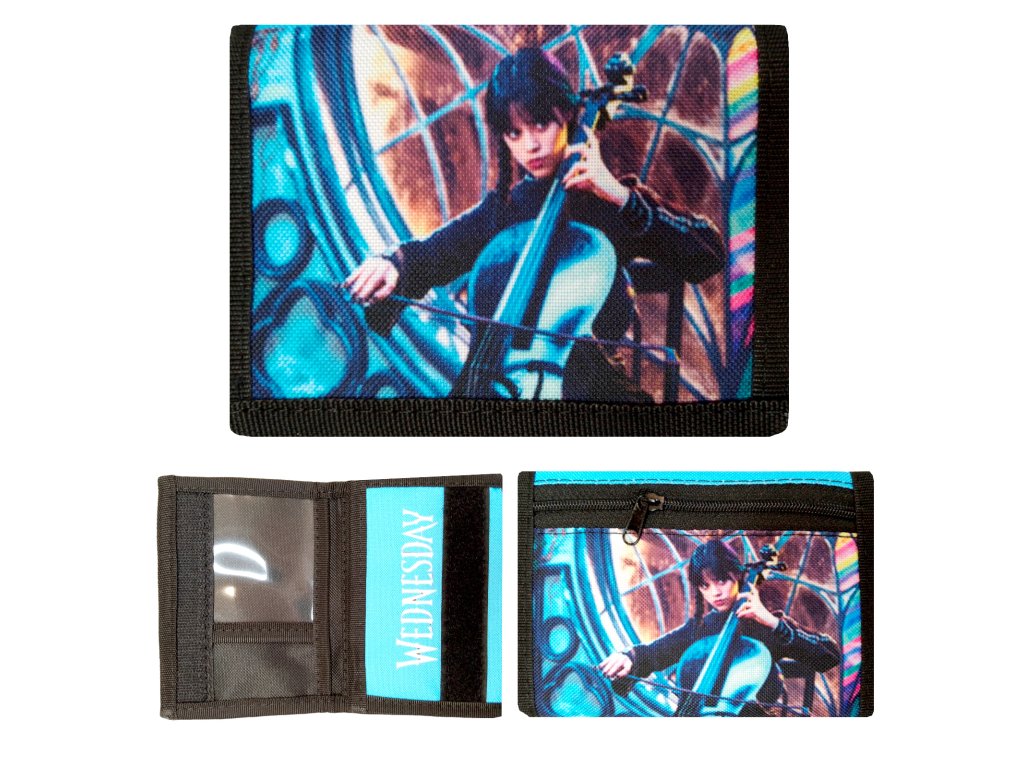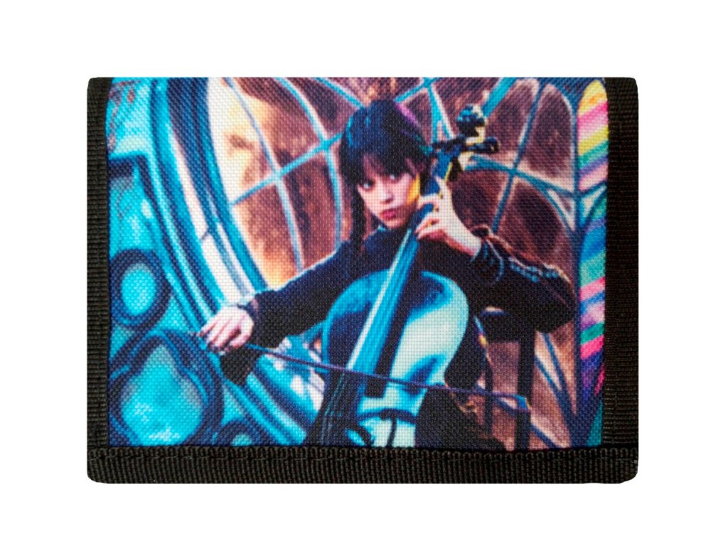 Na přední straně peněženky je poutavý obrázek Wednesday Addams hrající na violoncello, což podtrhuje její unikátní a temně hudební charakter. Obrázek je vyveden v intenzivních barvách, které kombinují černou a modrou, čímž vytváří dramatický efekt, který jistě upoutá pozornost.