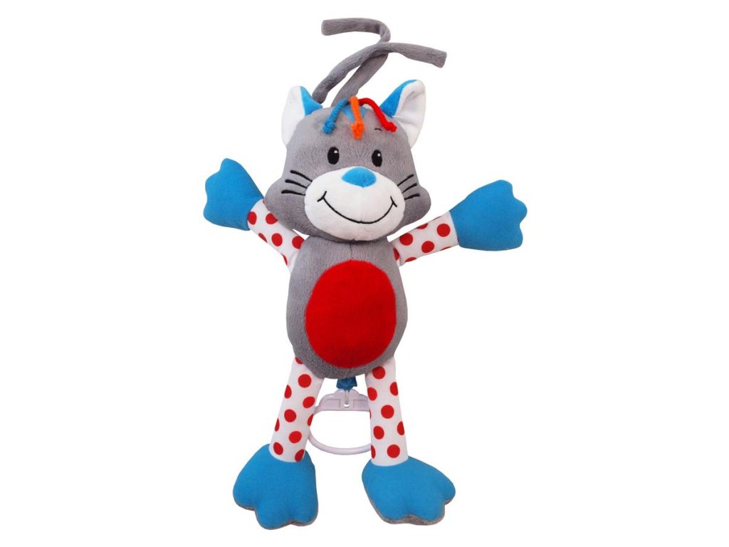 Plyšová hračka s hracím strojkem Baby Mix ve tvaru kočičky. Kočka má šustící části, tkaničky pro zavěšení a hrací strojek.