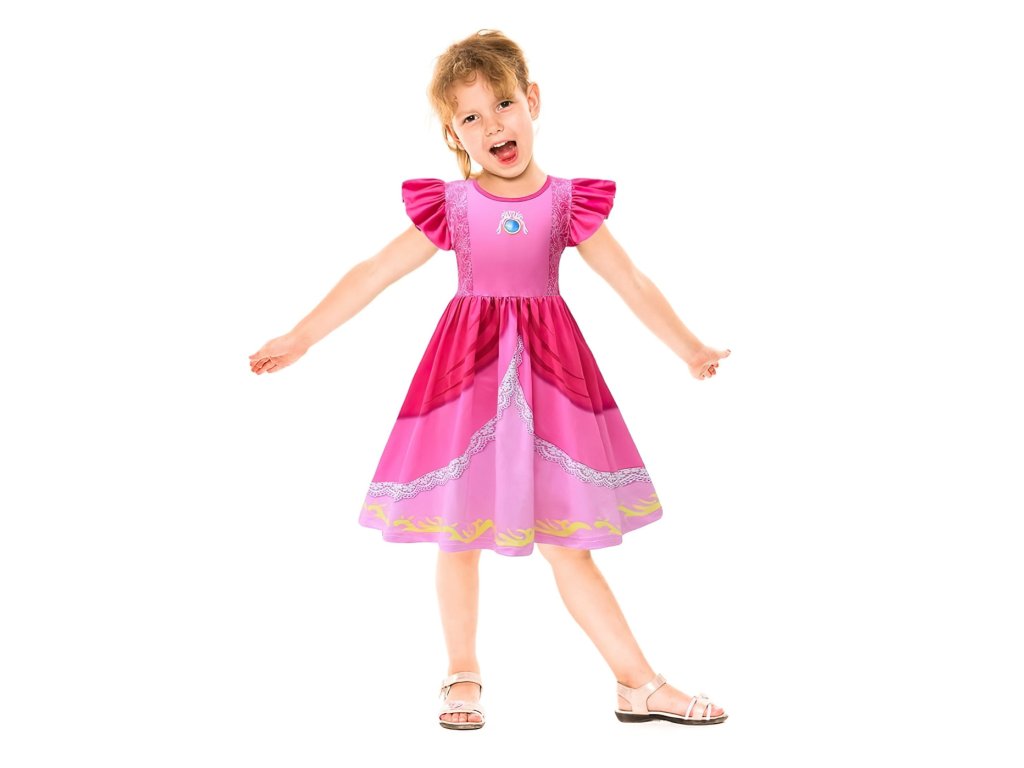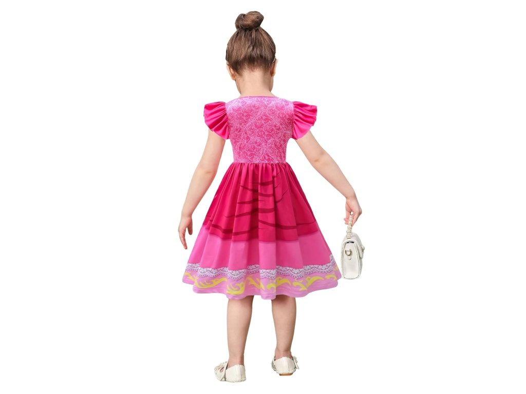Šaty jsou navrženy v sytě růžových a fialových odstínech s potiskem krajky a ozdob, které evokují královský styl. Na hrudníku je tištěný modrý drahokam s korunkou, který celému modelu dodává kouzelný detail.