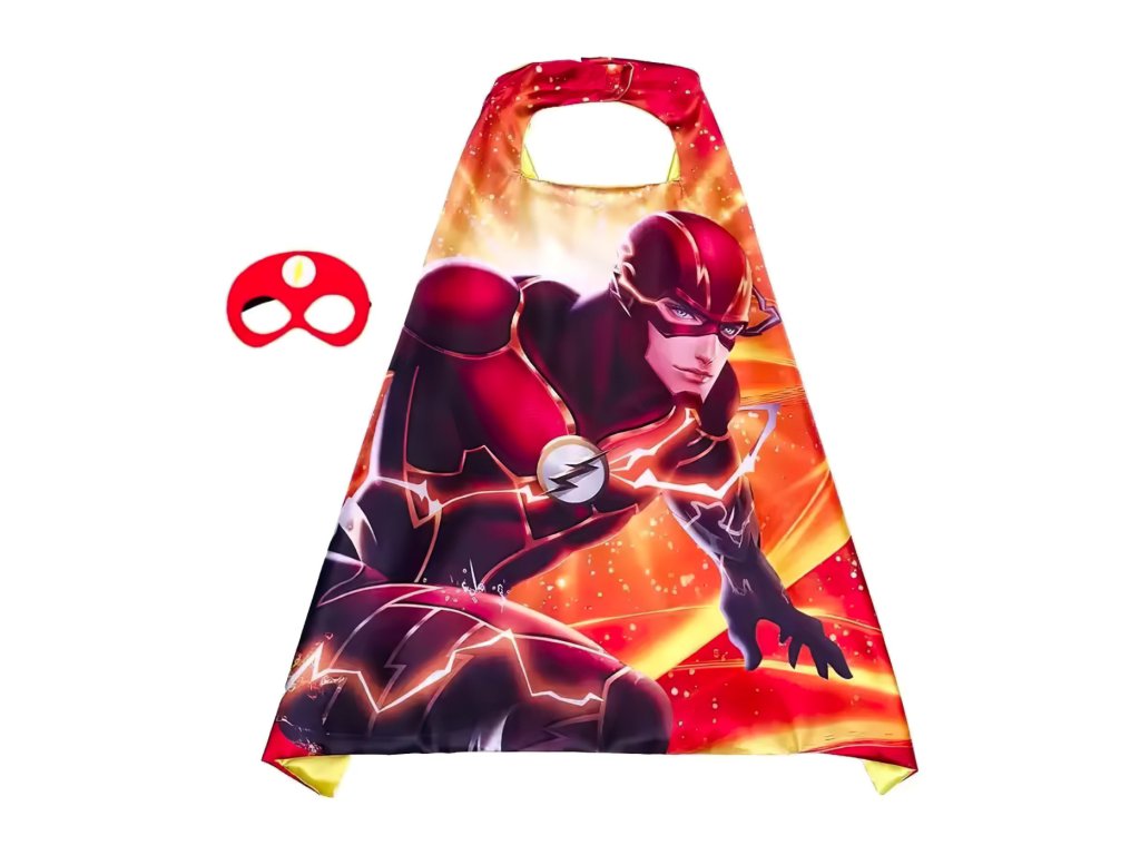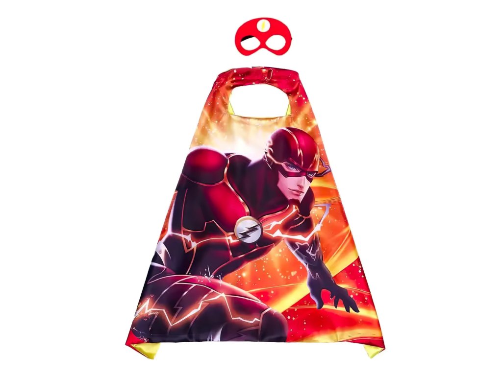 Sada obsahuje stylový plášť s výrazným potiskem superhrdiny Flashe a červenou masku s ikonickým bleskem, která dotváří autentický vzhled hrdiny ze světa DC Comics.
