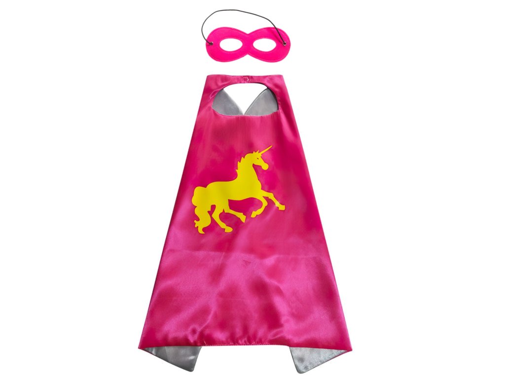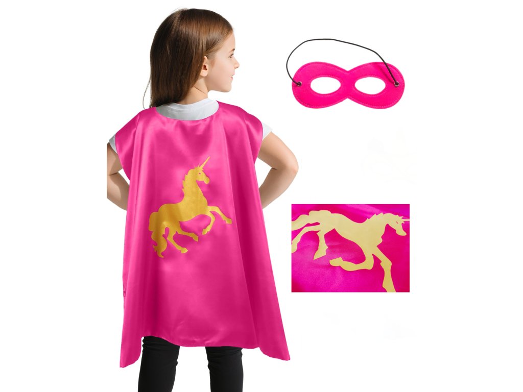 Plášť v sytě růžové barvě zdobí velký zlatý jednorožec, který působí elegantně a hravě zároveň. Součástí balení je také maska ve stejné barevné kombinaci, díky níž se dítě snadno převtělí do tajemné pohádkové bytosti.