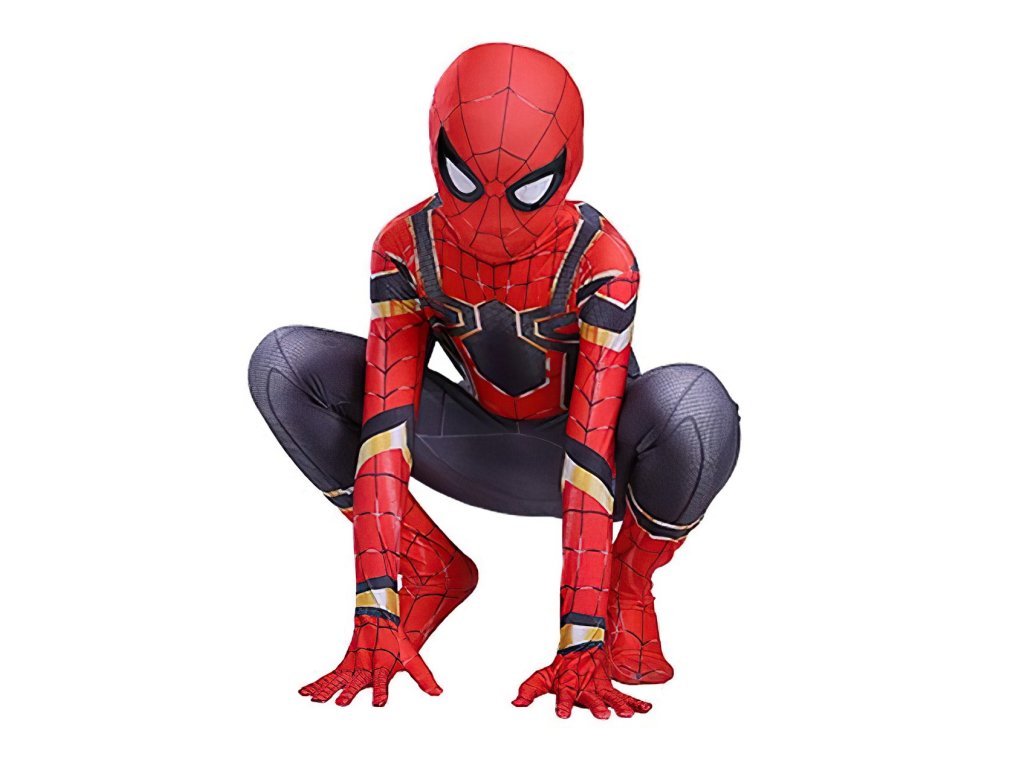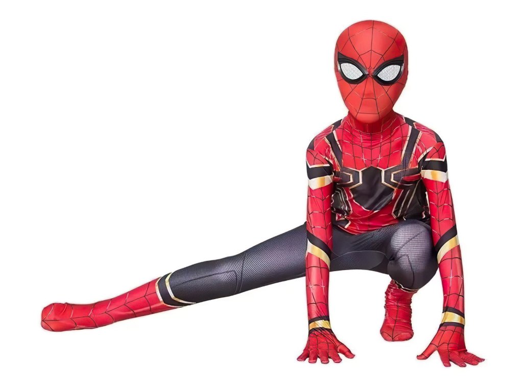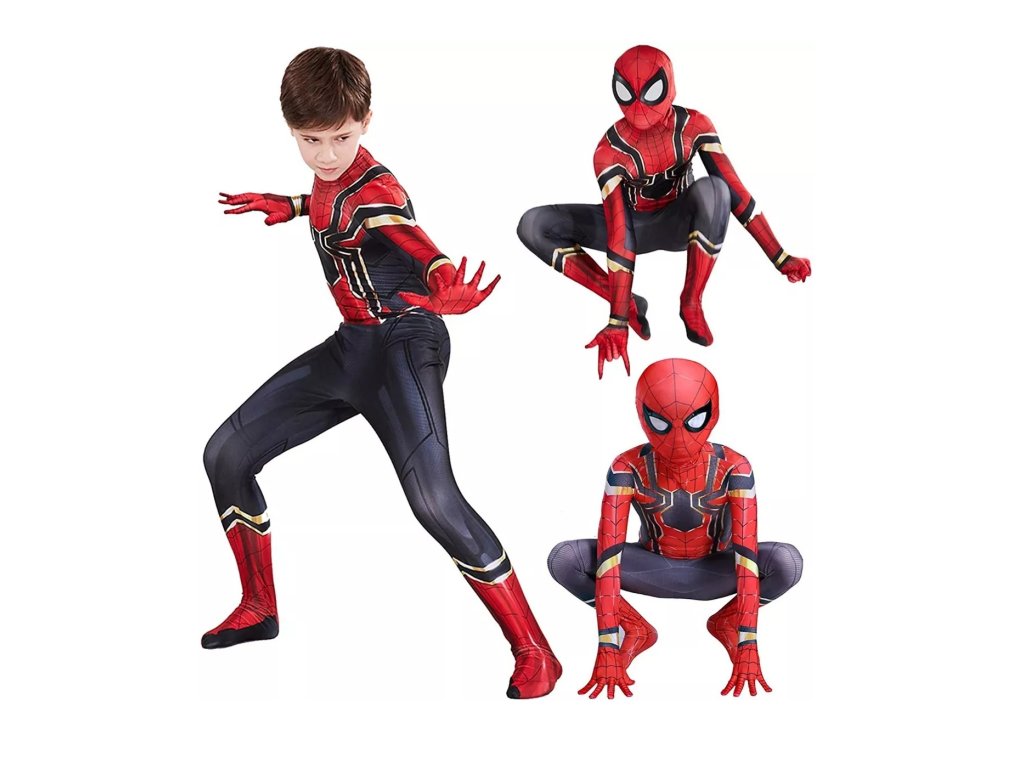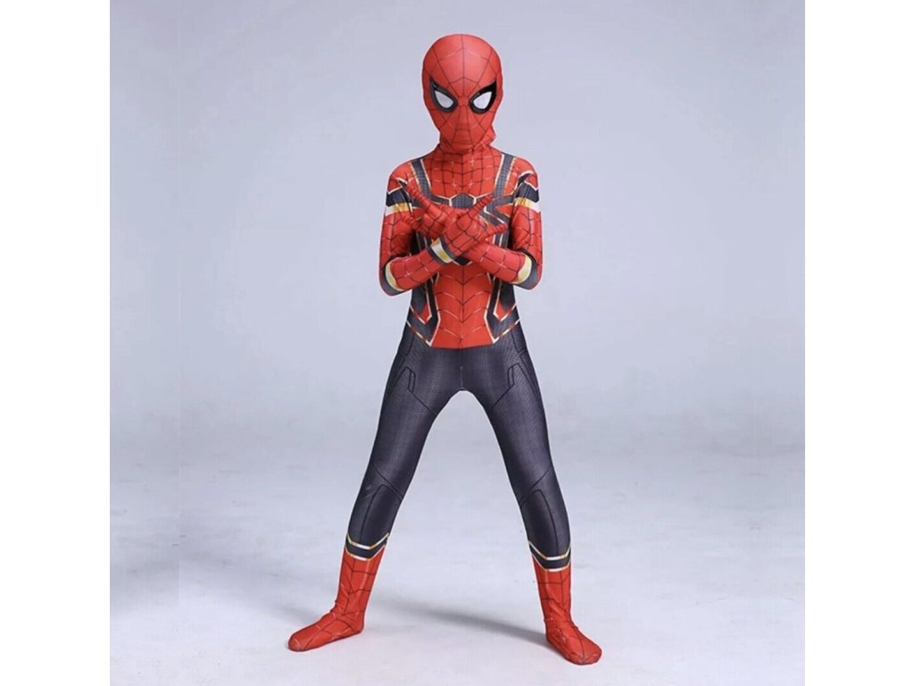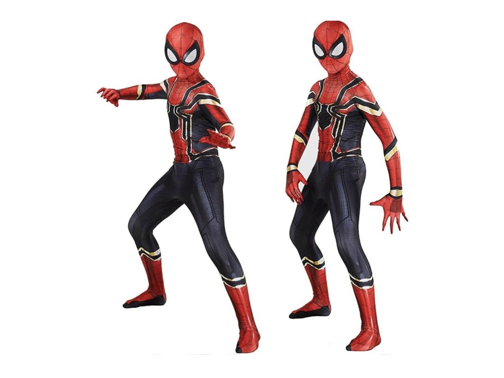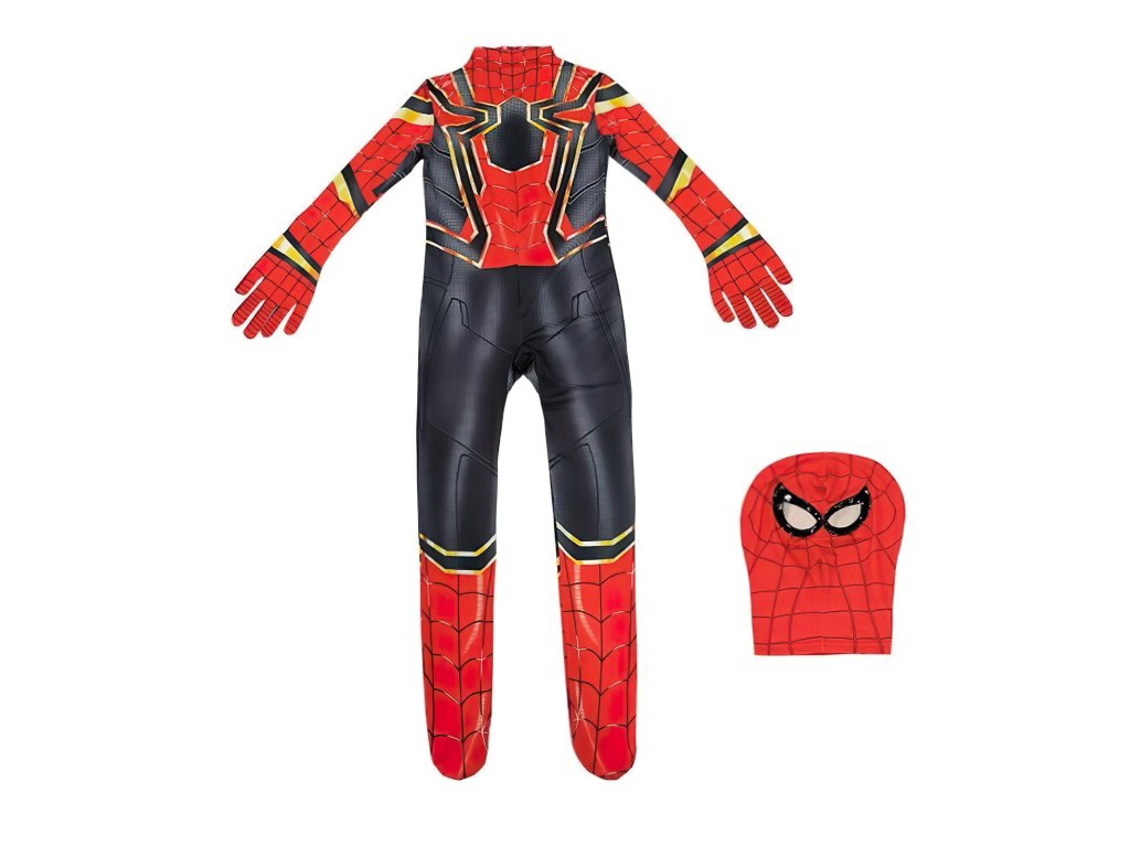 Kostým obsahuje celotělový elastický overal, zapínaný v zadní části na zip, který je navržen tak, aby přesně kopíroval vzhled Spidermanova obleku, včetně detailních černých a zlatých linií, které se nacházejí na hrudi a rukávech. Overal je vkusně ukončen až u prstů na rukách a na nohou, což zajišťuje kompletní pokrytí a autentičnost vzhledu. Součástí kostýmu je také elastická látková maska, která dokonale zakrývá hlavu, takže dítě může zůstat inkognito jako skutečný Spiderman. Maska je pohodlná, umožňuje volné dýchání a vidění skrz oči.