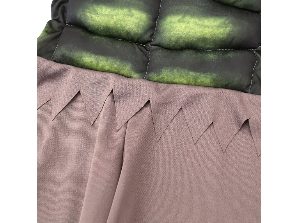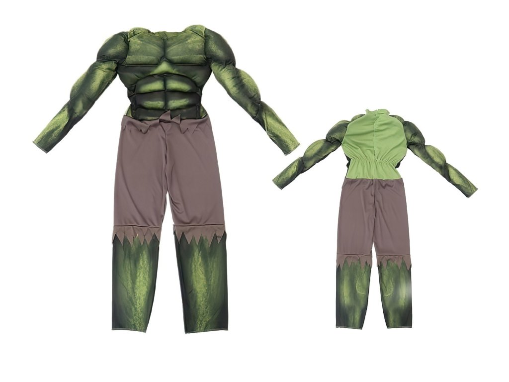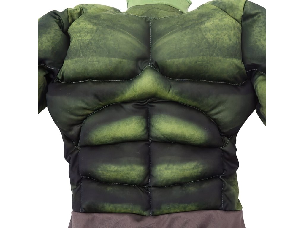 Horní díl kostýmu je vyroben z měkkého polyesterového materiálu s vypodloženými „svaly“, které dodávají postavě mohutnost a sílu, přesně jako u Hulka. Kalhoty mají zubatý okraj, což připomíná roztržené oblečení po Hulkově proměně. Kostým je lehký, prodyšný a pohodlný na nošení po celý den.