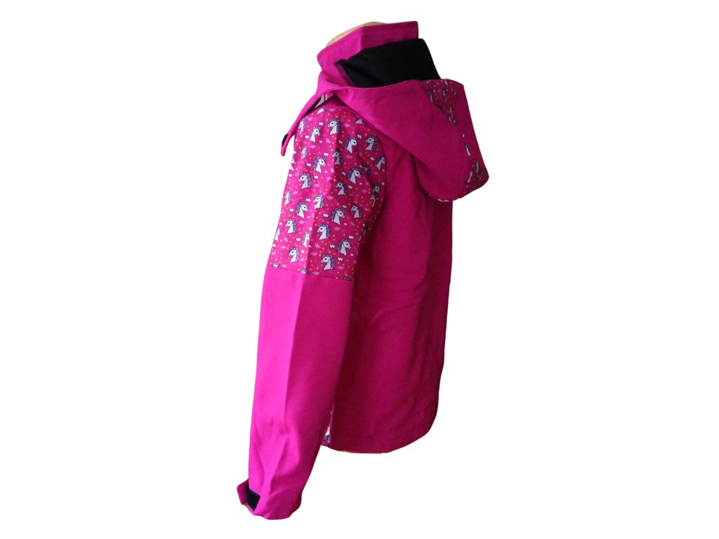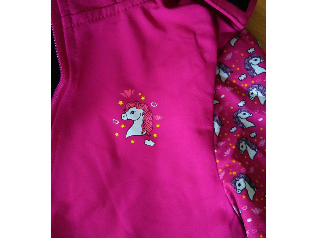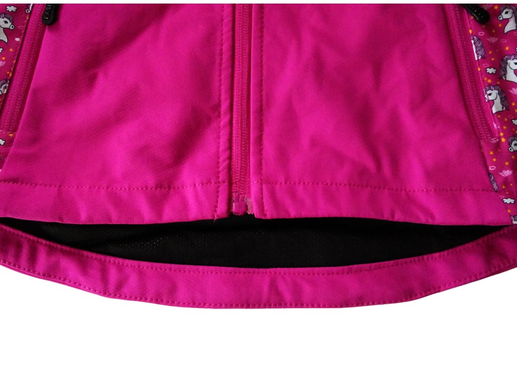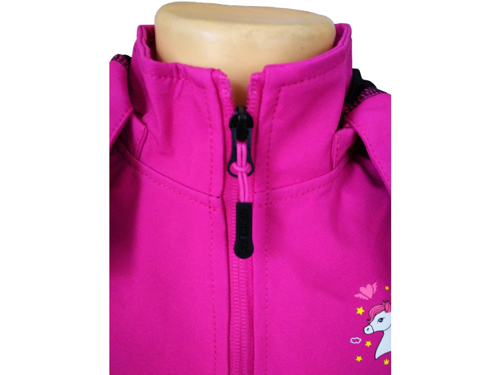 Softshell bundy jsou bundičky do každého pochmurného či chladného počasí. Dívčí bunda s koníky je velmi kvalitní svým zpracováním i materiálem. Bundička je lehčí, bez vyteplené podšívky, má prodlouženou zádovou část šitou do oblouku. U krku stojáček, aby nezafukovalo a samozřejmostí je i odepínací kapuca na zip. Přední kapsy jsou také se zapínáním na zip, vnitřní bez zapínání. Rukávy jsou na koncích opatřeny regulací a suchý zip.