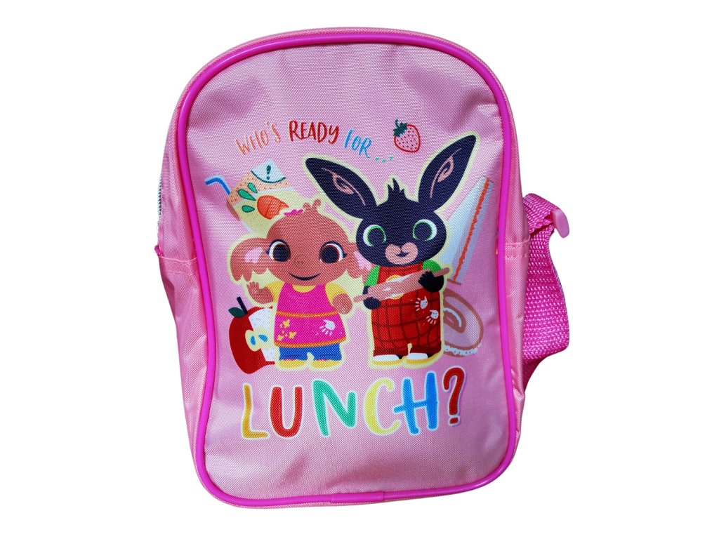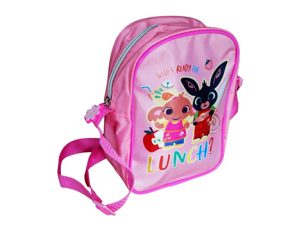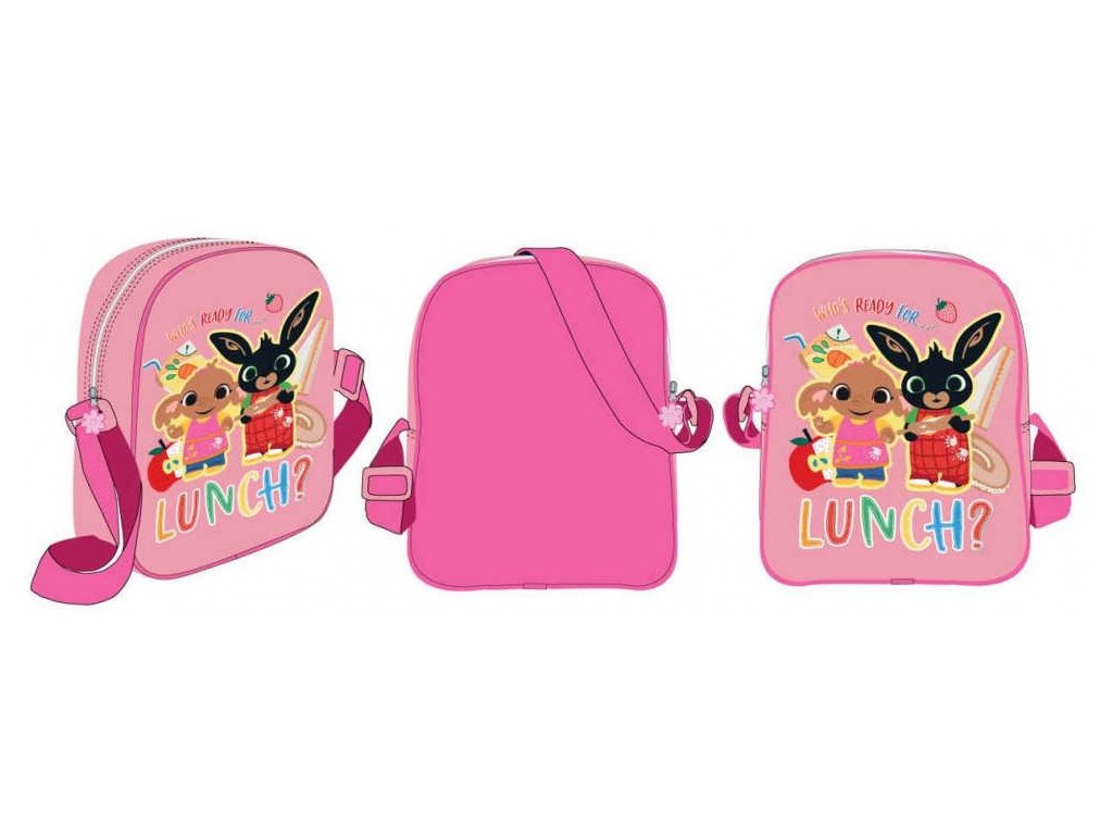 Králíček Bing a slonice Sula se právě chystají na výborný oběd. Asi mají v tašce výbornou svačinku, aby na výletě nebyl hlad. Praktická a zároveň velmi krásná taška přes rameno se zajíčkem Bingem a jeho kamarádkou Sulou je prostorná, má zapínání na zip. Na jezdci zipu je gumová ozdoba ve tvaru kytičky. Popruh je s regulací délky. Tašku děti využijí na výlety, při cestě na kroužek i na hřiště.