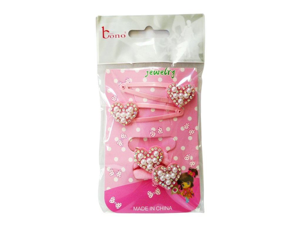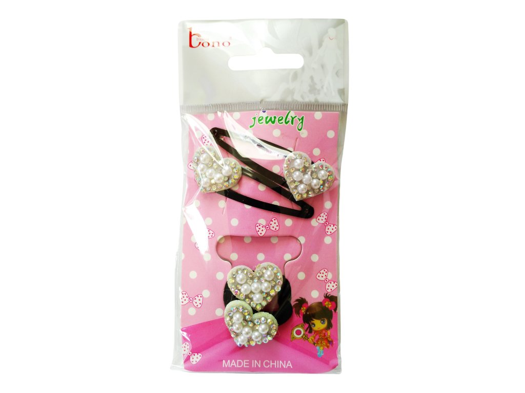 Vlasový set se srdíčky, zdobeným kamínky a drobnými perličkami. Set obsahuje 2 sponky prolamovačky a 2 gumičky s motýlky. Set holky uchvátí a určitě udělá radost i jako drobný dárek.