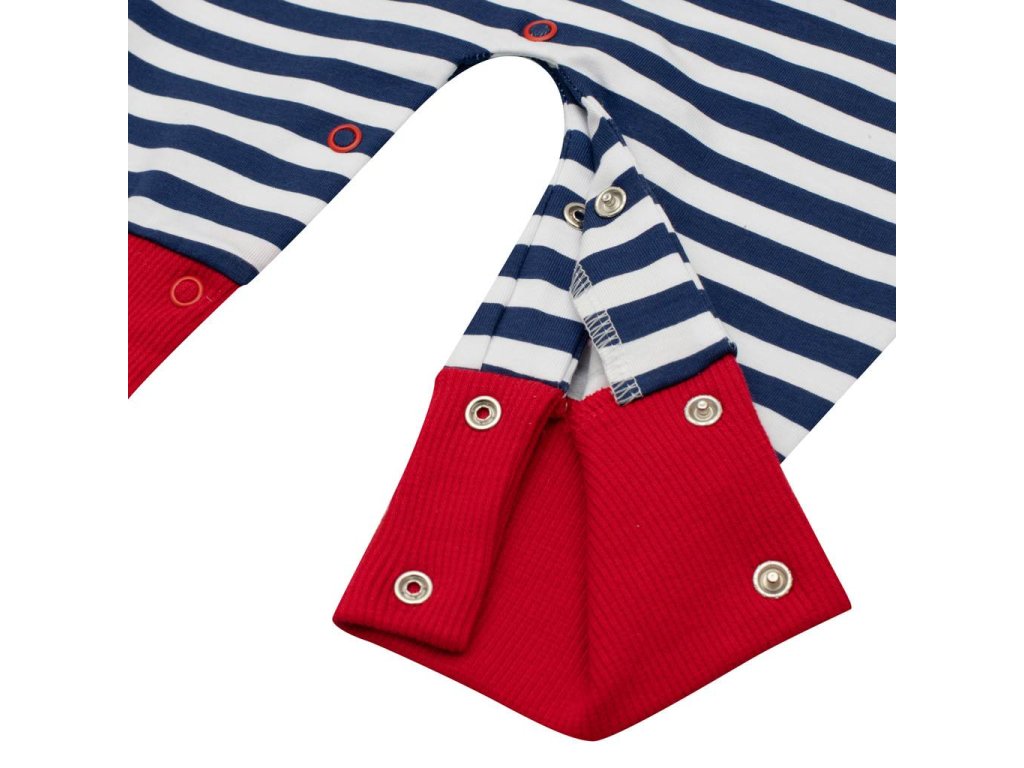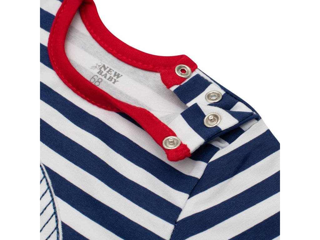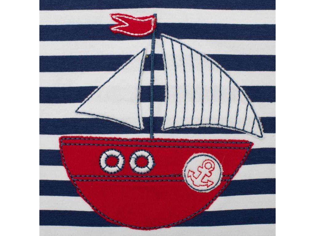 Letní bavlněný overálek české značky New Baby Marine pro miminka. Overálek je celopotištěný moderními pruhy s krásnou nášivkou lodičky. Nášivka je podlepená látkou proti poškrábání. Zapínání na ramínku a mezi nožičkama usnadňuje oblékání a přebalování miminka. Pro miminka je overal důležitým kouskem oblečení a při jakémkoliv pohybu jsou zádička miminka stále přikrytá.