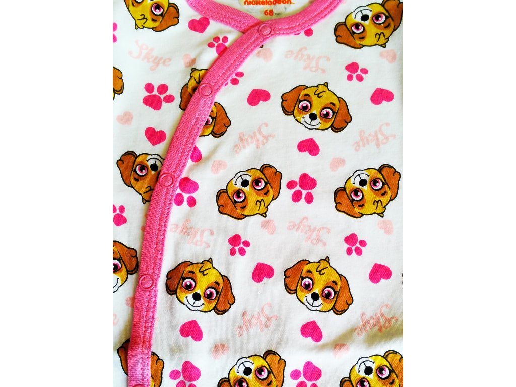Suprový bavlněný overálek s motivy roztomilé psí záchranářky Skye. Overal je pro miminka velmi příjemný na pokožku, nevyhrnuje se a nespadává, je to jeden z nejpraktičtějších oblečků pro nejmenší. Pro pohodlné oblékání má overálek zapínání na patentky, které jsou směrovány k jedné straně od krku až po nárt.