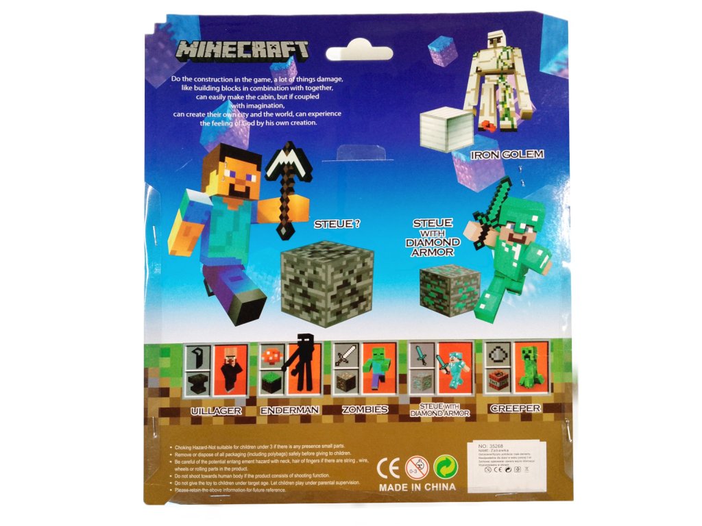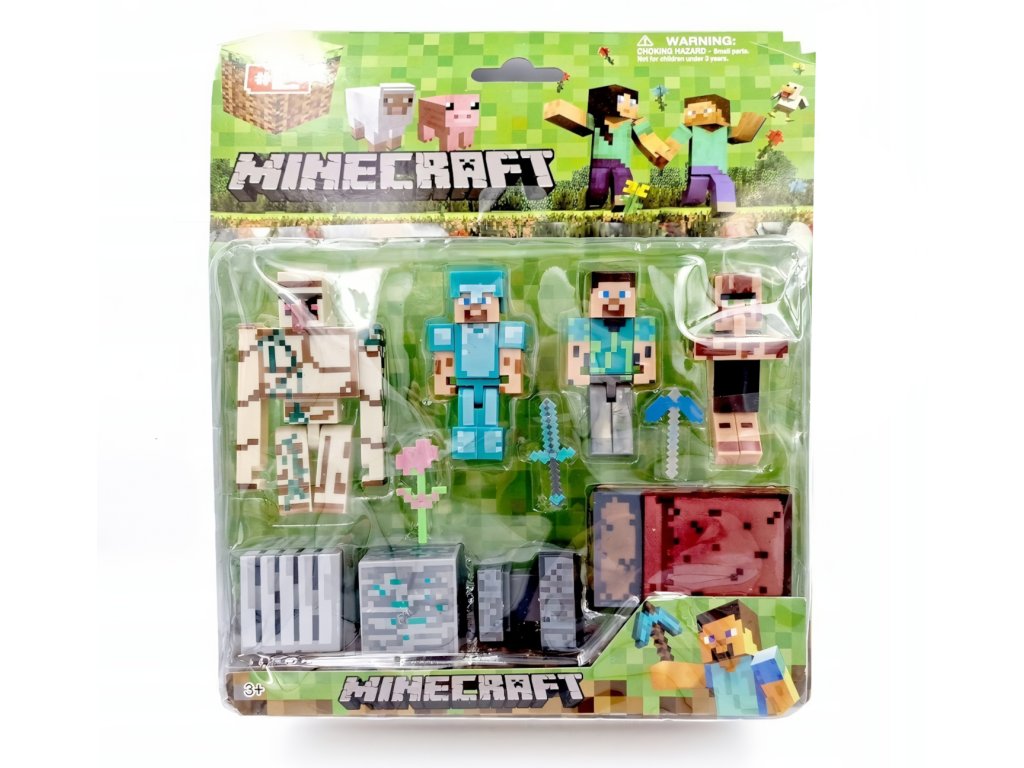 Balení obsahuje ikonické postavy, jako je Steve s diamantovým brněním, klasický Steve, Iron Golem a další postavičky, které znáte ze světa Minecraftu. Všechny figurky mají typický pixelový vzhled, který věrně kopíruje styl hry.