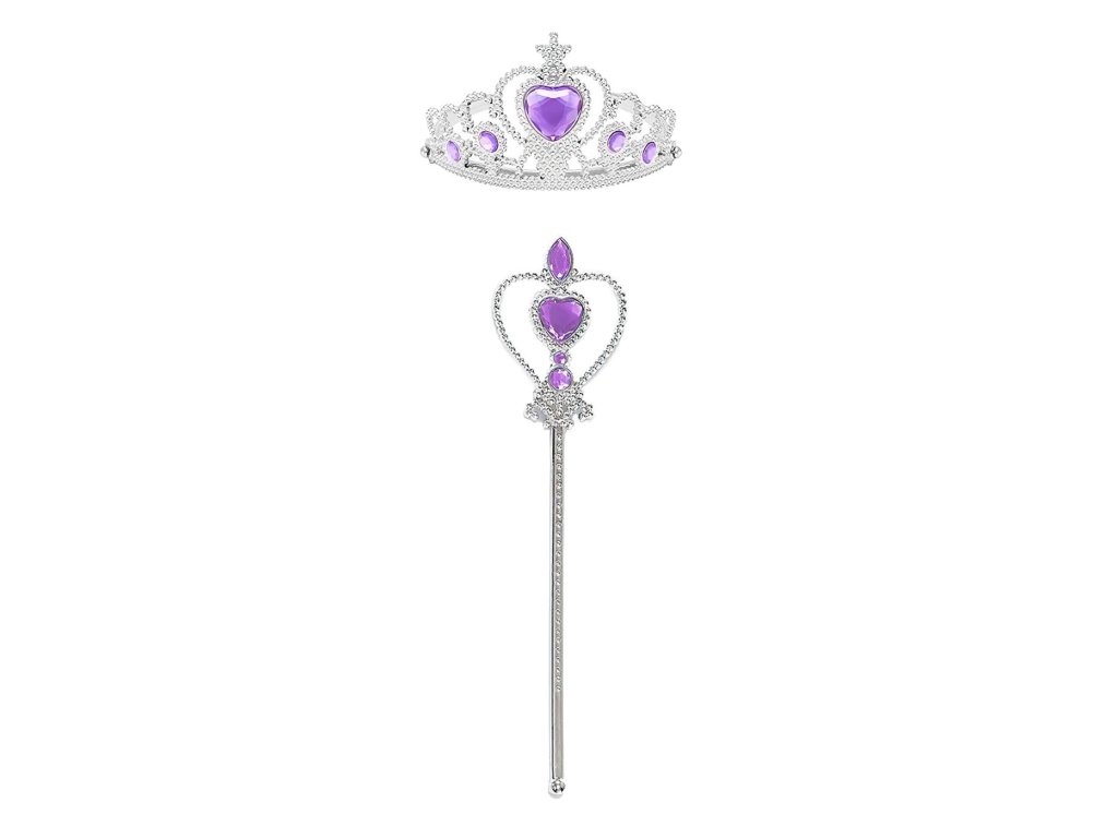Elegantní korunka a ladící žezlo jsou zdobeny fialovými kamínky ve tvaru srdce, které dodávají celému vzhledu jemný královský nádech. Korunka je lehká a pohodlná na nošení, vyrobená z plastového materiálu s jemnými detaily, které připomínají kouzelnou atmosféru království. Díky pružnému provedení dobře drží na hlavě a je ideální pro dětské hraní i slavnostní chvíle.