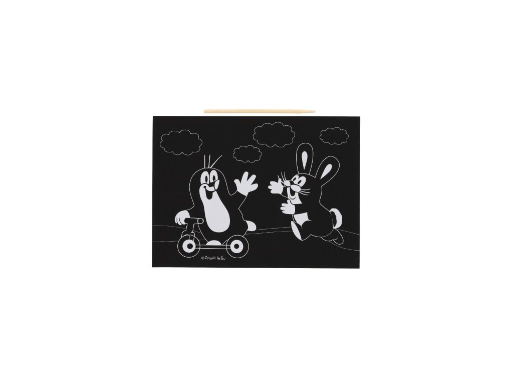 Prohánět se na koloběžce, to je paráda. A Krteček a jeho kamarád Zajíc zabaví i vaše děti prostřednictvím škrabacích obrázků. Vyškrabává se pomocí dřívka, které je součástí balení.