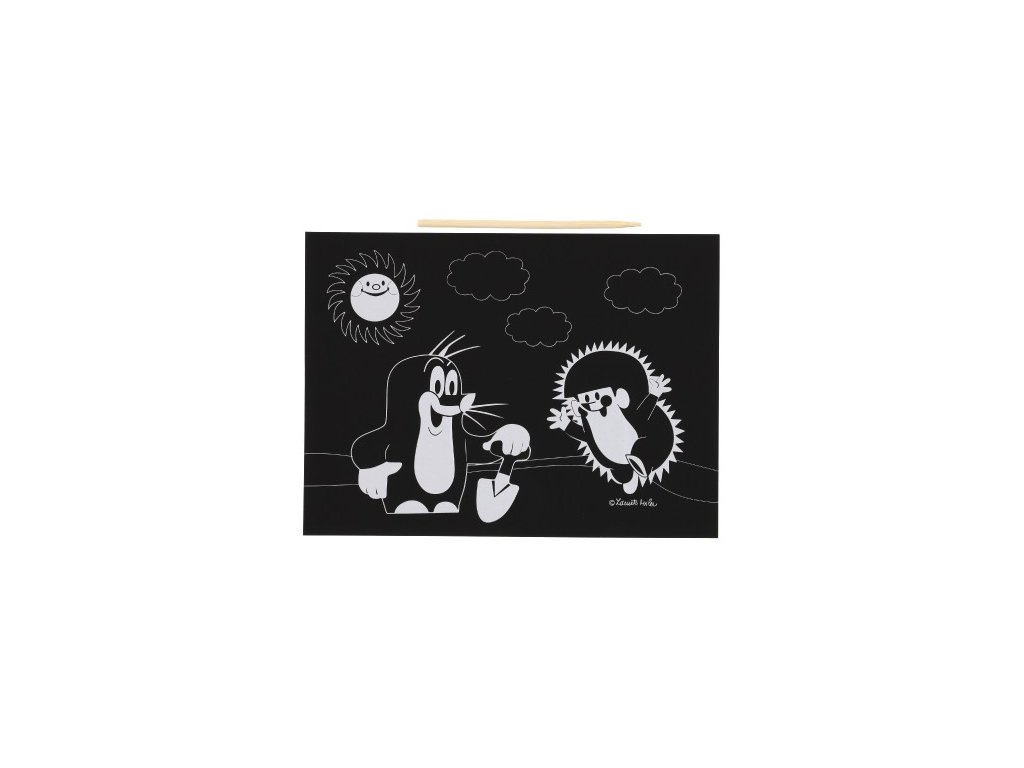 Krteček se chystá na zahradu a spolu s Ježečkem nese vašim dětem obrázek k vyškrabání. Vyškrabává se pomocí dřívka, které je součástí balení.