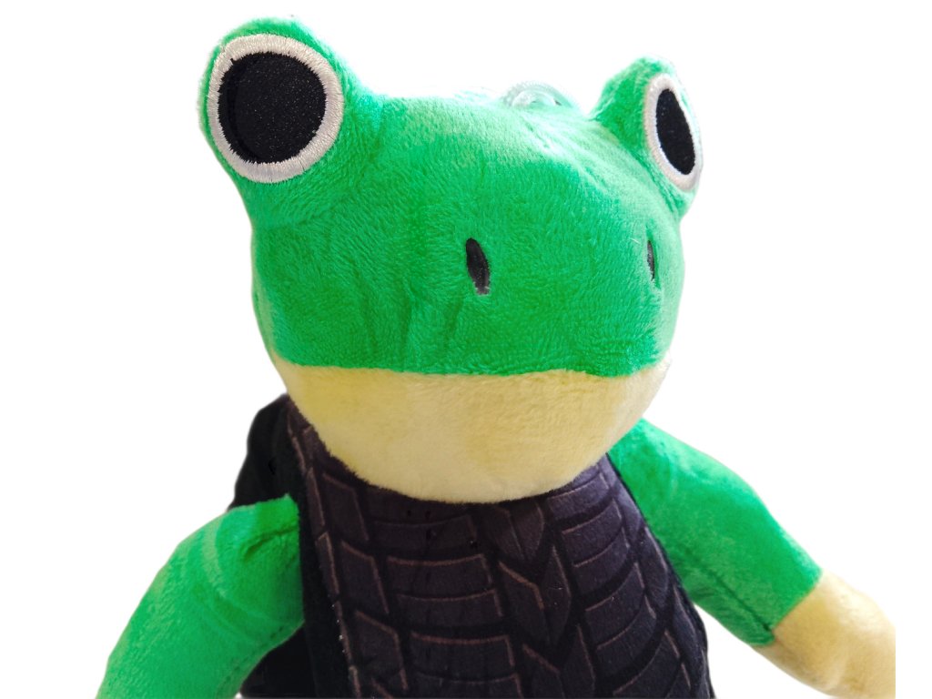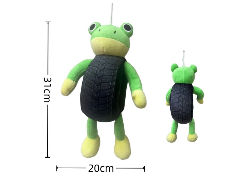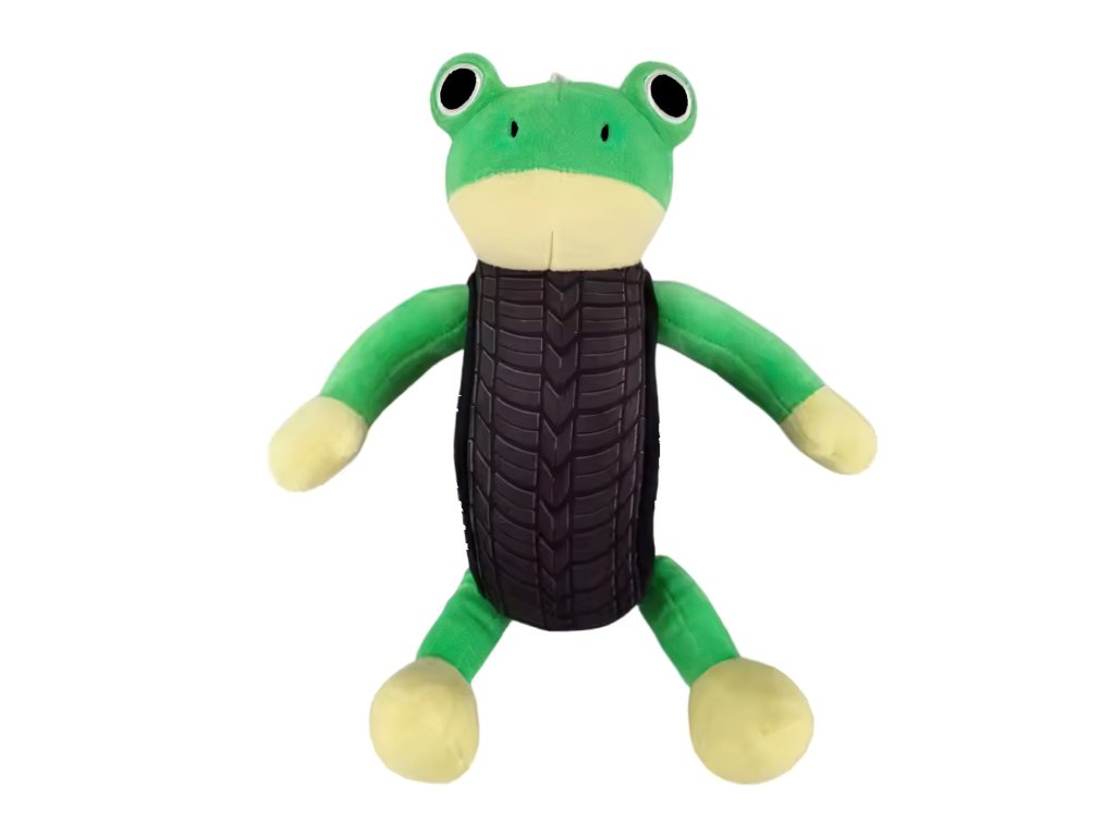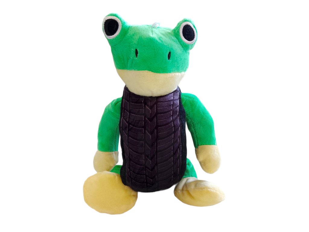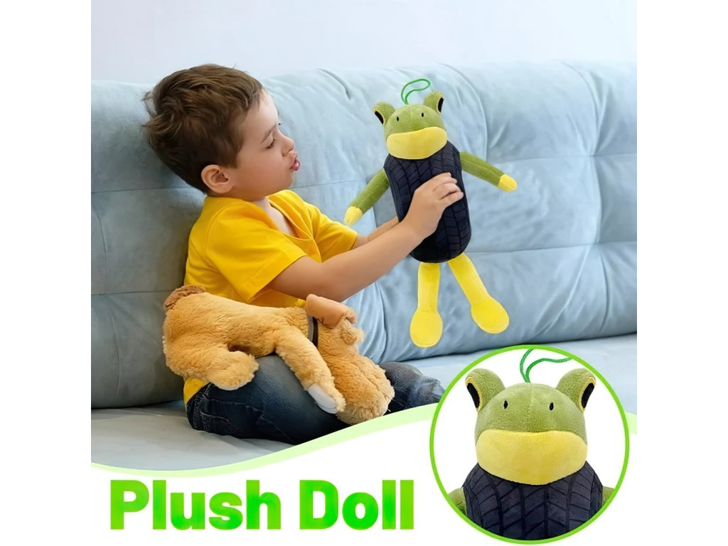 Tělo žáby je vyrobeno z měkkého plyše v zeleno-žlutém provedení, zatímco přední část tvoří realisticky vypadající černá pneumatika s jemně vystouplým vzorkem. Kombinace jemnosti a nečekaného prvku zajišťuje nejen vizuální kontrast, ale i hmatovou pestrost při hraní nebo mazlení. Je ideální jako plyšový společník i originální dekorace.