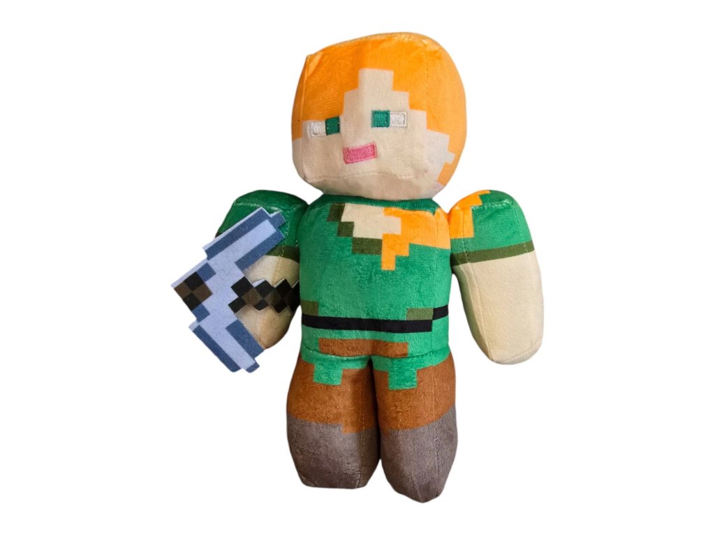 Plyšová hračka Minecraft Alex s krumpáčem představuje jednu z hlavních postav světa Minecraftu v typickém pixelovém designu.