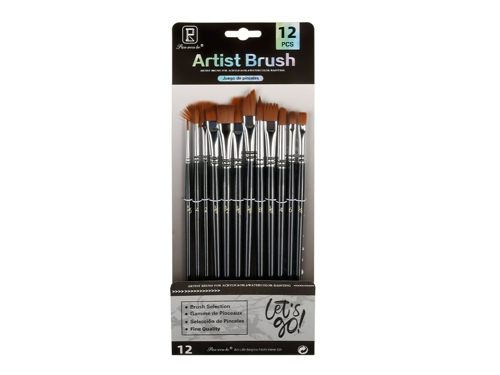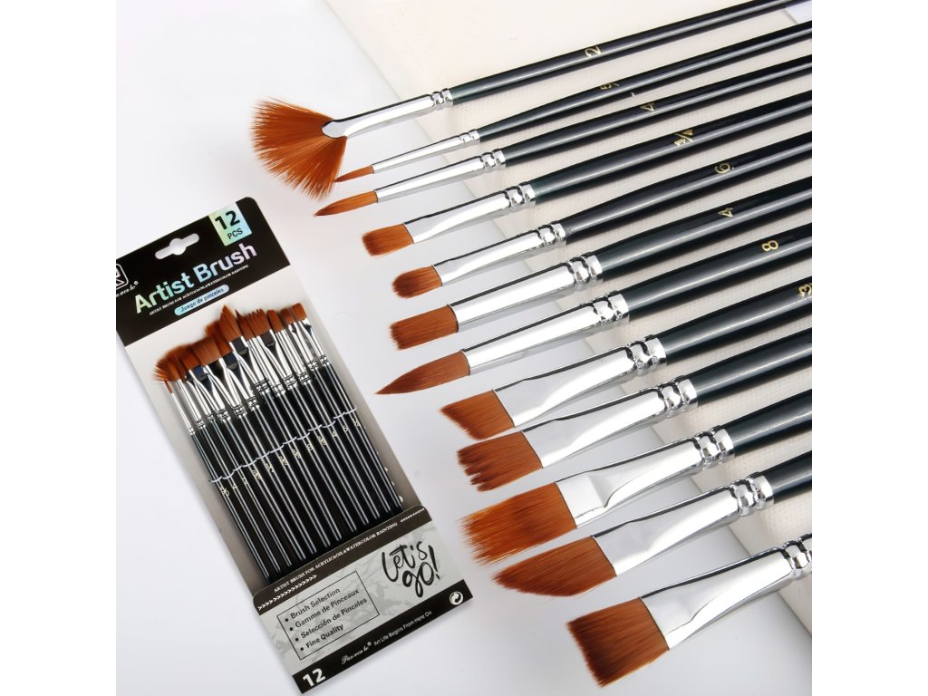 Sada 12 uměleckých štětců nabízí pestrý výběr tvarů a velikostí pro všechny vaše výtvarné potřeby, včetně nanášení barev na obličej a tělo.