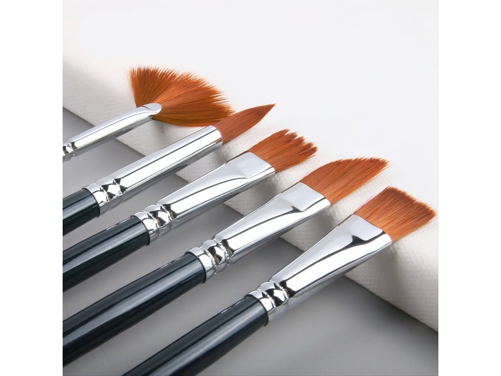 Štětce jsou vyrobeny ze syntetických vláken, která napodobují vlastnosti přírodního vlasu, ale zároveň poskytují vyšší odolnost a snadnější údržbu. Vlákna dobře drží tvar a rovnoměrně rozvádějí barvu, což zaručuje plynulý a konzistentní tah. Kovové objímky pevně drží štětiny a zajišťují dlouhou životnost každého štětce.