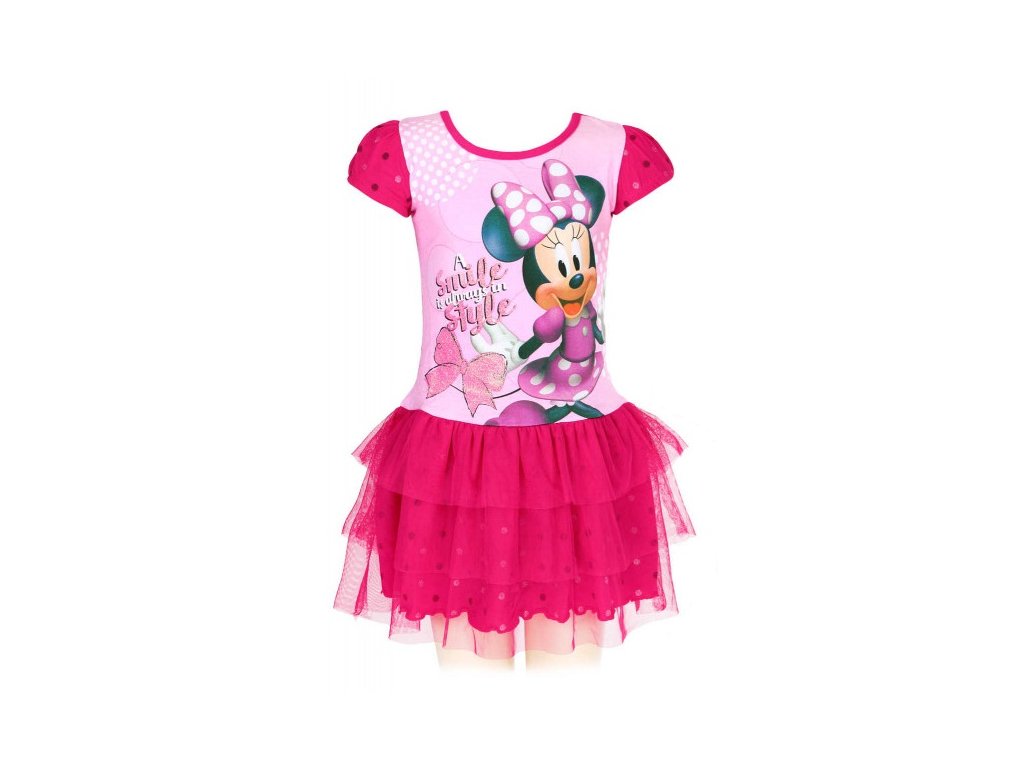 Nádherné a velmi slušivé šaty, příjemný materiál a pohodlný střih, sukně je zdobena metalickými puntíky a doplněna třemi tylovými řasenými volánky. Tyl je krásně jemný, měkkoučký. Motiv myšky Minnie je celolátkový, přizdoben třpytkami. Rukávky jsou také potaženy tylovou vrstvou.