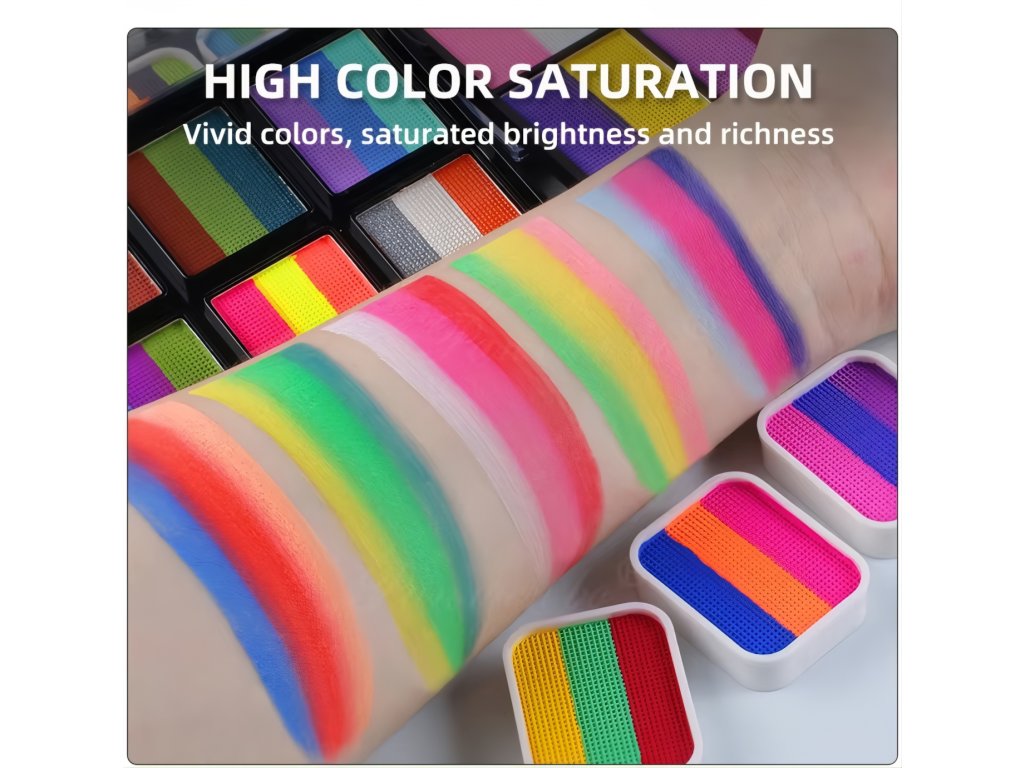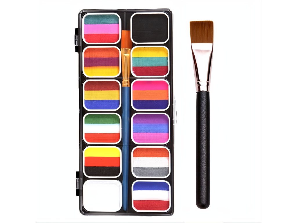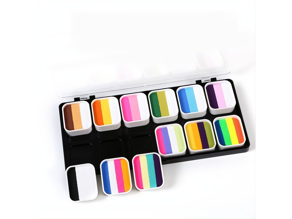 Obsahuje 10 palet se sytými barvami uspořádanými do pruhů pro snadné míchání a vytváření duhových efektů. Nechybí ani dvě základní barvy – bílá a černá. Barvy jsou na vodní bázi, snadno se nanášejí a smývají a jsou šetrné k dětské pokožce.