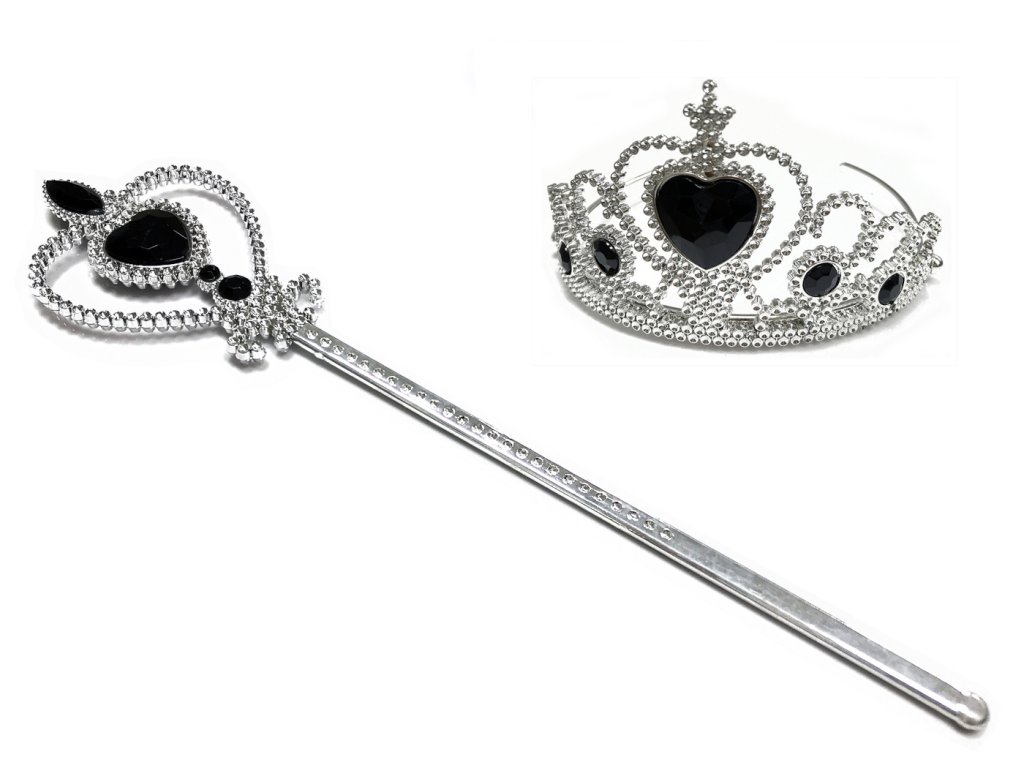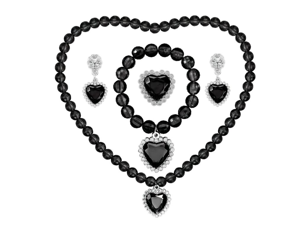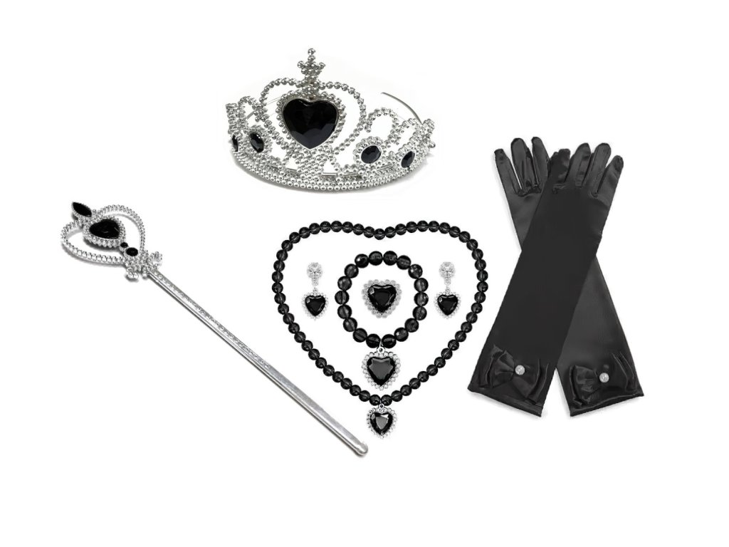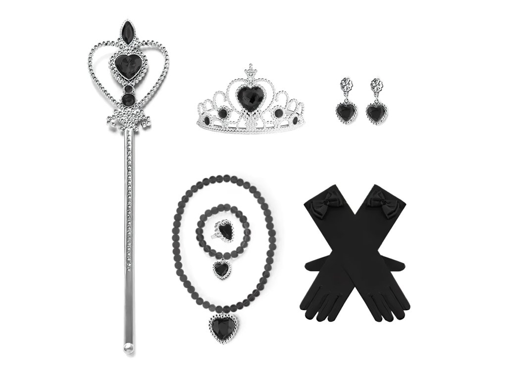 Sada zahrnuje černé rukavice, čelenku s ozdobou, náhrdelník, náušnice, prsteny a další tematické doplňky inspirované gotickou estetikou Wednesday. Všechny šperky a ozdoby jsou sladěny do černé a stříbrné barvy, které podtrhují ponurý, ale elegantní styl postavy.
